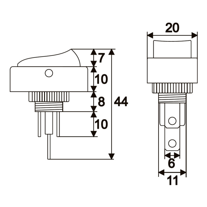 Kapcsoló típusa: SPST Áramerősség: 20 A / 12 V DC Beépítési méret: 12,5 mm Max. panelvastagság: 4 mm Csatlakozók mérete: 6.3 mm Led színe: Piros Kapcsoló színe: Fekete