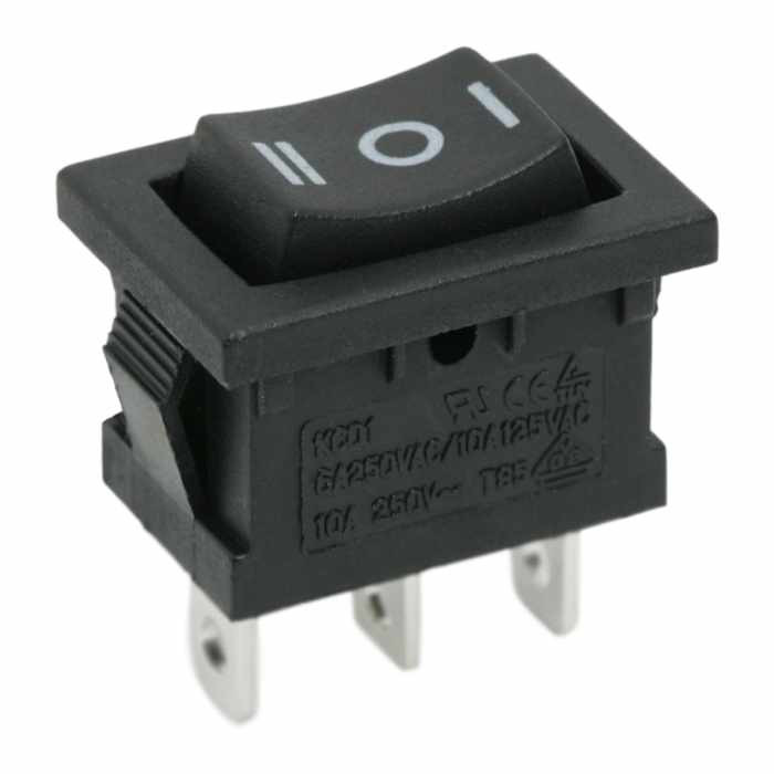 Beépíthető, fekete, 3 állású billenőkapcsoló. Széles körben használt, ideális lehet, műszaki gépek, elektromos eszközök kezelőpaneljén. Középső nyitott állás, és két szélső zárt jellemzi.
