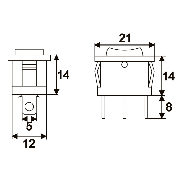 Kapcsoló típusa: SPDT Áramerősség: 6 A (10 A) / 250 V AC Beépítési méret: 19,5 x 13 mm Kapcsoló mérete: 21 x 15 mm Csatlakozók mérete: 8 x 5 mm Kapcsoló színe: Fekete