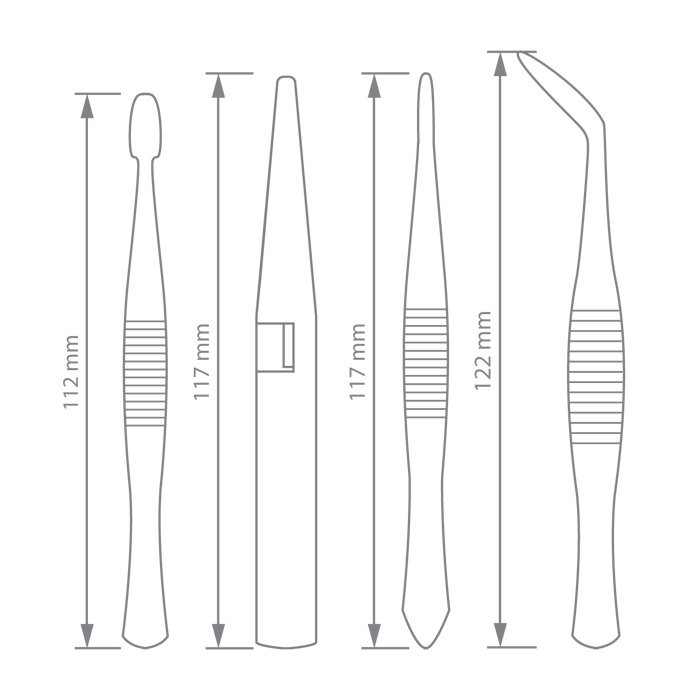 Lapos csipesz mérete: 112 mm Szorító(önzáró) csipesz mérete: 117 mm Egyenes csipesz mérete: 117 mm Hajlított csipesz mérete: 122 mm
