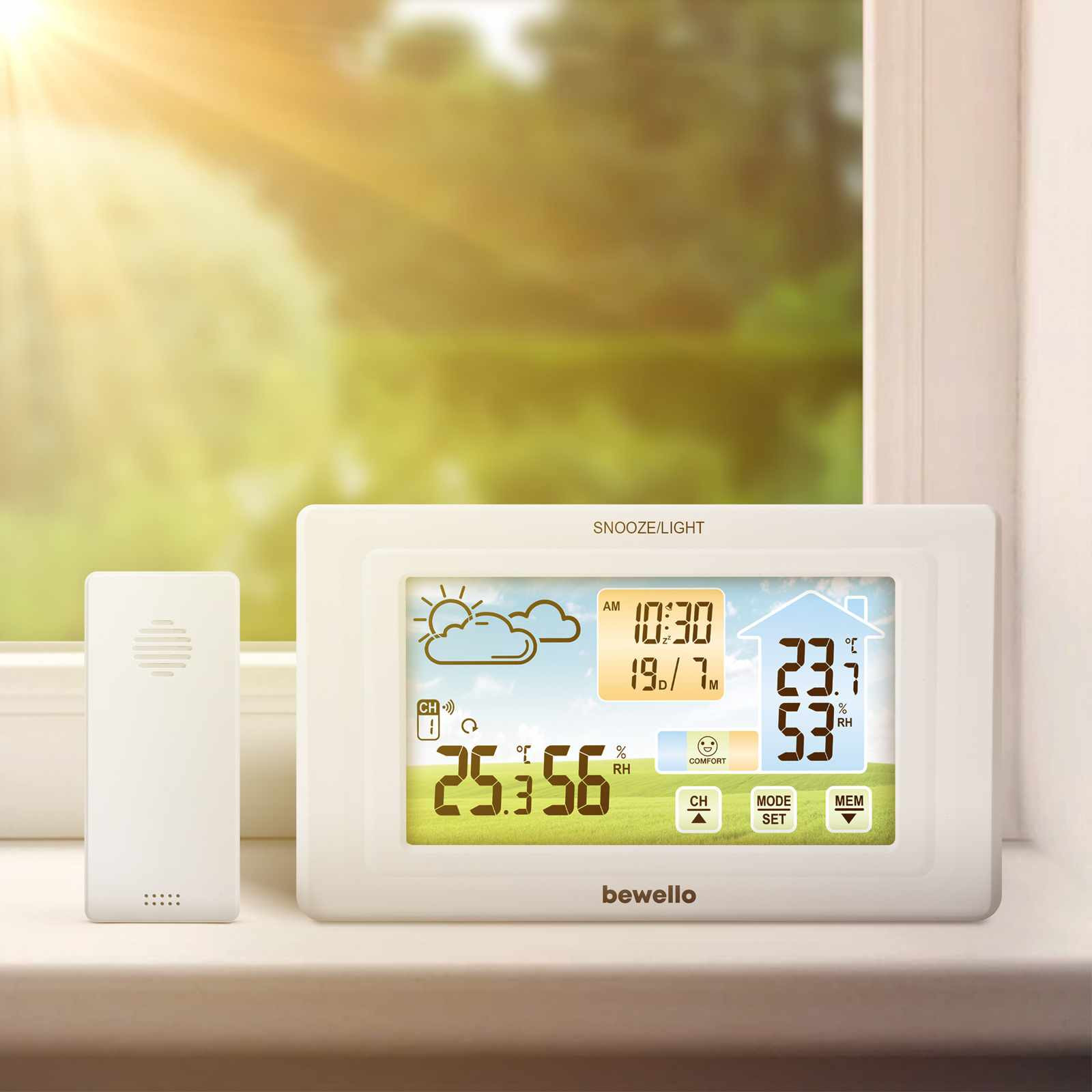 Ez az ébresztőóra funkciókkal rendelkező eszköz ideális választás a beltéri és a kültéri hőmérséklet- és páratartalom mérésére is. Fehér színben érhető el, amely modern és elegáns megjelenést kölcsönöz bármely környezetnek. A készülék nagyméretű digitális kijelzővel rendelkezik, amelyen egyszerűen leolvashatók a mért értékek. Az érintésérzékeny felület pedig lehetővé teszi a kényelmes váltást a mérési értékek és beállítások között. A készüléken beállítható az ébresztési idő és lehetőség van szundi használatára is.