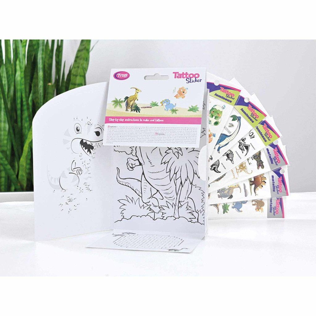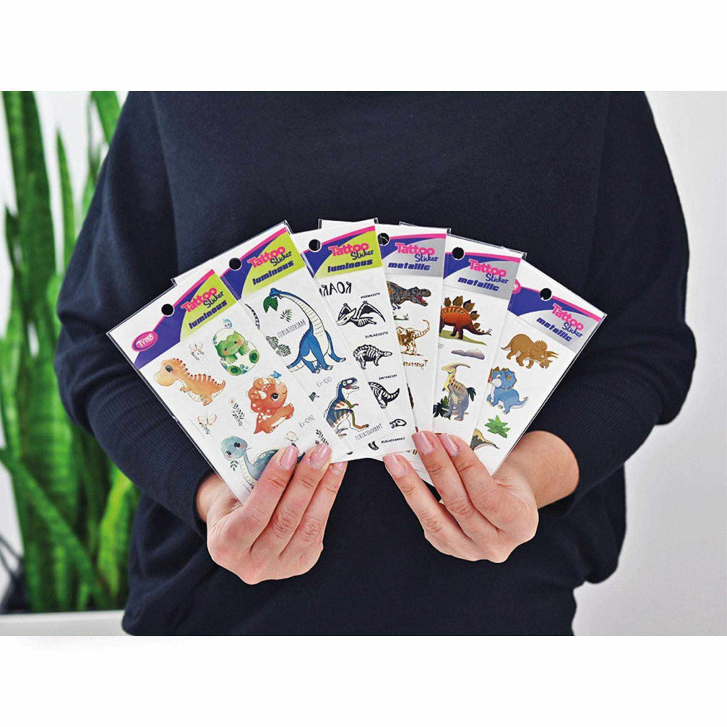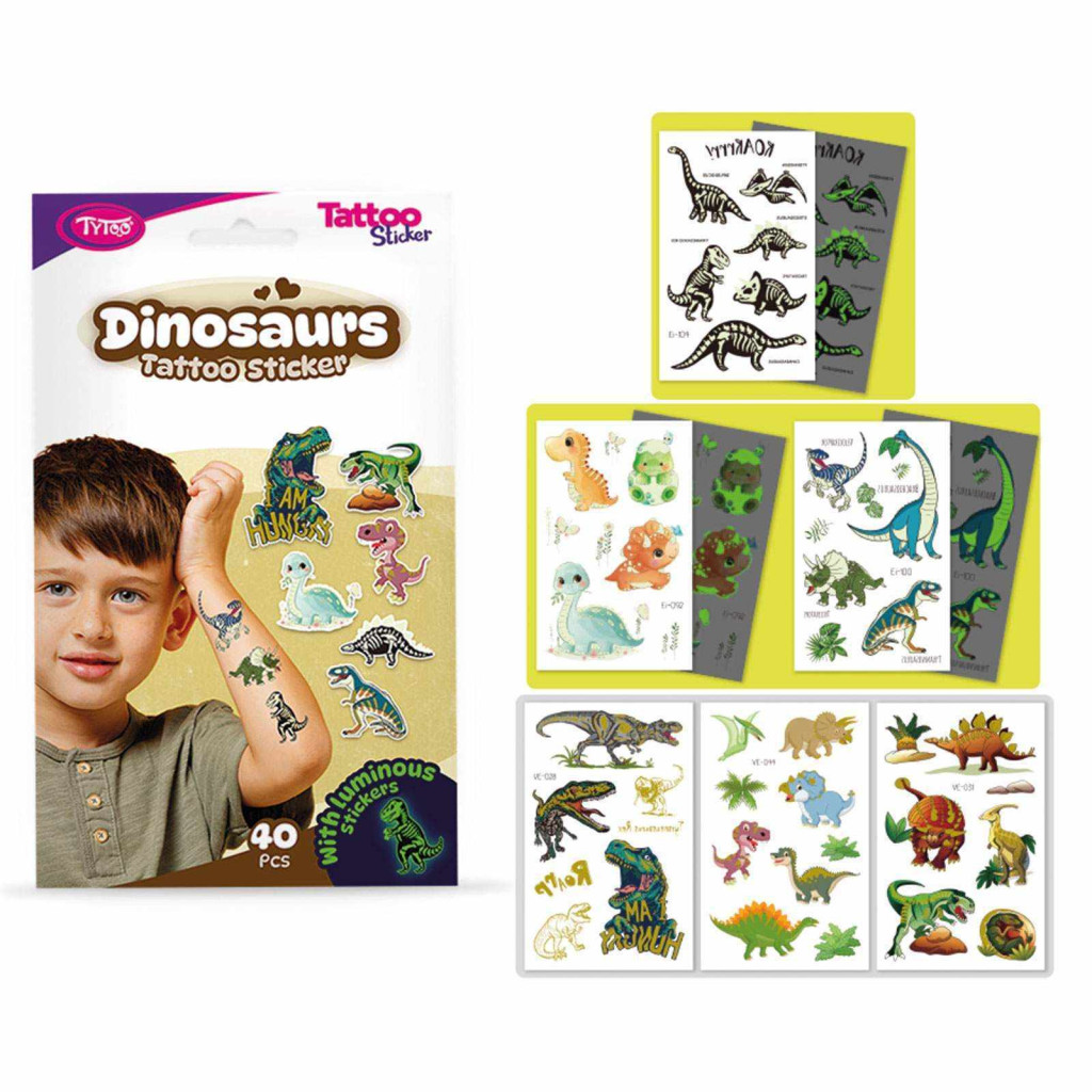 Minden ami dínós! Könnyen felvihető, egyszerű és látványos tetkók, dinoszaurusz mintákkal, szettben. Igazi Dinoszaurusz imádó gyerekeknek. Ezek az ideiglenes tetoválás matricák kiváló minőségűek, így hosszabb ideig, napokig is megőrzik élénk színüket és részletgazdagságukat. Könnyen felhelyezhetőek és eltávolíthatóak, anélkül hogy irritálnák vagy károsítanák a bőrt. 40 db Dinoszaurusz matrica tetoválás 6 db íven: Nagy dínók, kis dínók, baby dínók, világítós dínók és T-Rex. Minden, ami dínó!