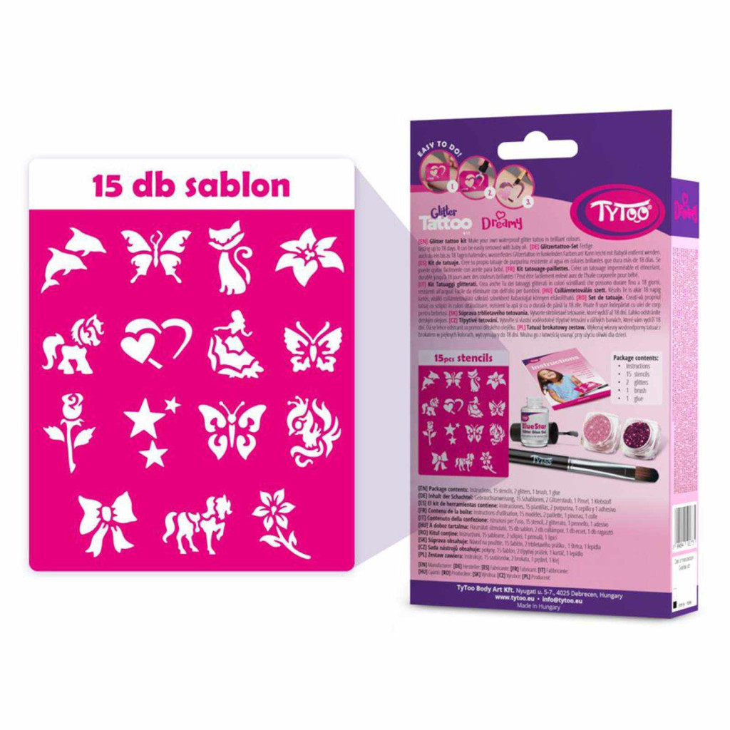 15 db heteken át tartó ragyogó csillámtetoválást készíthet kislányoknak, egyszerűen. A szettben mindent megtalál a tetkók elkészítéséhez. Kifejezetten 3-12 éves kislányoknak tervezték, amelyben virágos és pillangós mintákat talál.A TyToo csillámtetoválást a gyermekek is biztonságosan használhatják, ugyanis kozmetikai minőségű anyagokat tartalmaz, ami megfelel az EU szabályoknak. Alkalmazása egyszerű, akár egy 6 éves kisgyermek is el tudja magának készíteni a saját csillámtetkóját. Ráadásul az alkotás közben még a készségeit is fejlesztheti. A szett tele van virágos, pillangós sablonokkal, melyek kifejezetten gyermeke pici karjára lettek tervezve. Így akár saját magának is könnyedén elkészítheti az apró szikrázó tetkóit, de közösen szórakozva még jobb móka lehet számára!