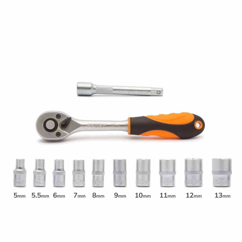 12 darabos racsnis dugókulcs készlet. 5 mm-es fejtől 13 mm-es fejig. A gumírozott nyél kényelmes fogást biztosít, a kompakt méretnek és a toldóelemnek köszönhetően nehezen hozzáférhető, kis helyeken is könnyen használható.