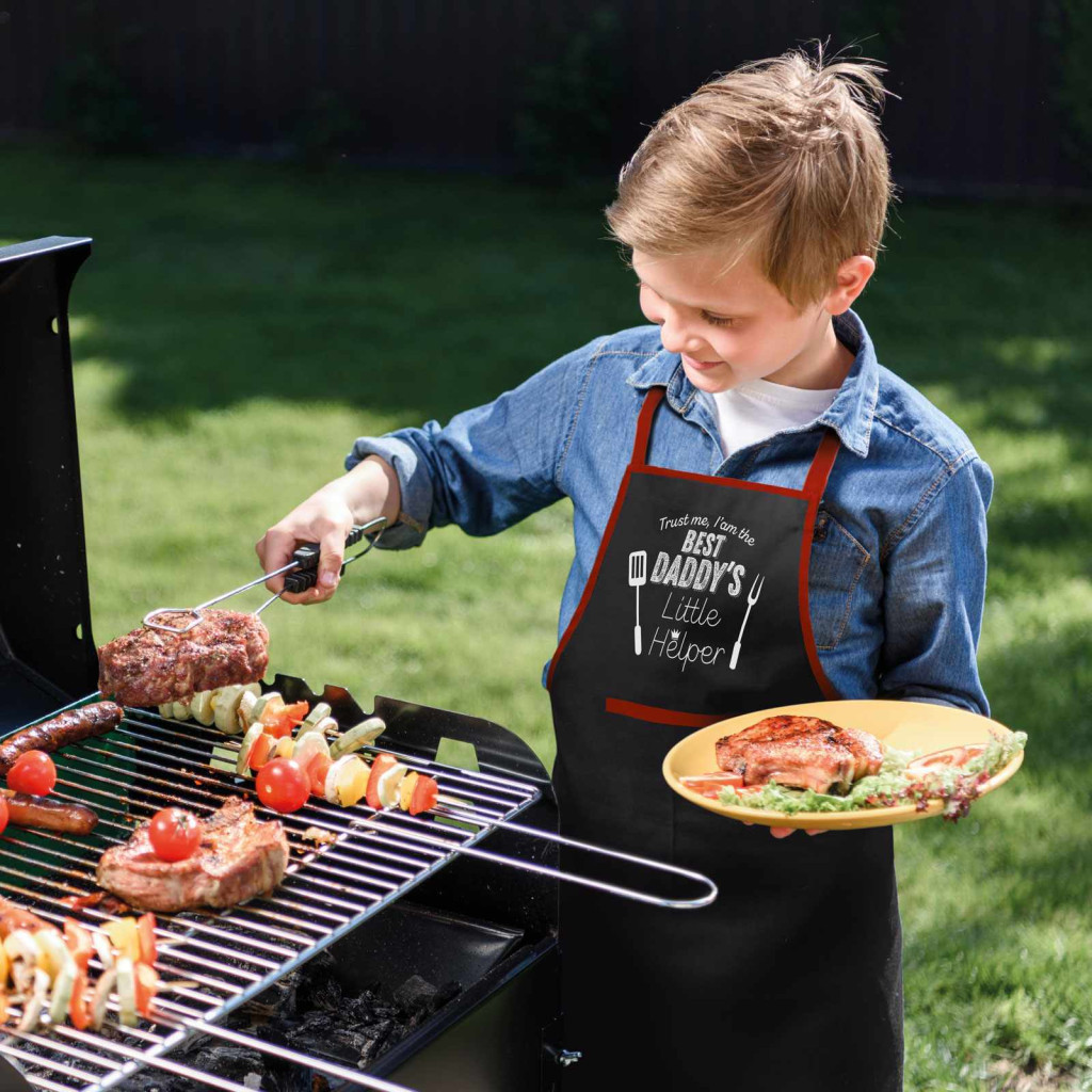 Praktikus kiegészítője a kerti sütögetésnek. Megvédi ruháját a zsírfoltoktól. Poliészter anyaga vízlepergető hatással bír. A középen lévő nagyméretű zsebben mindig magánál tudhatja a legfontosabb BBQ kellékeket.
