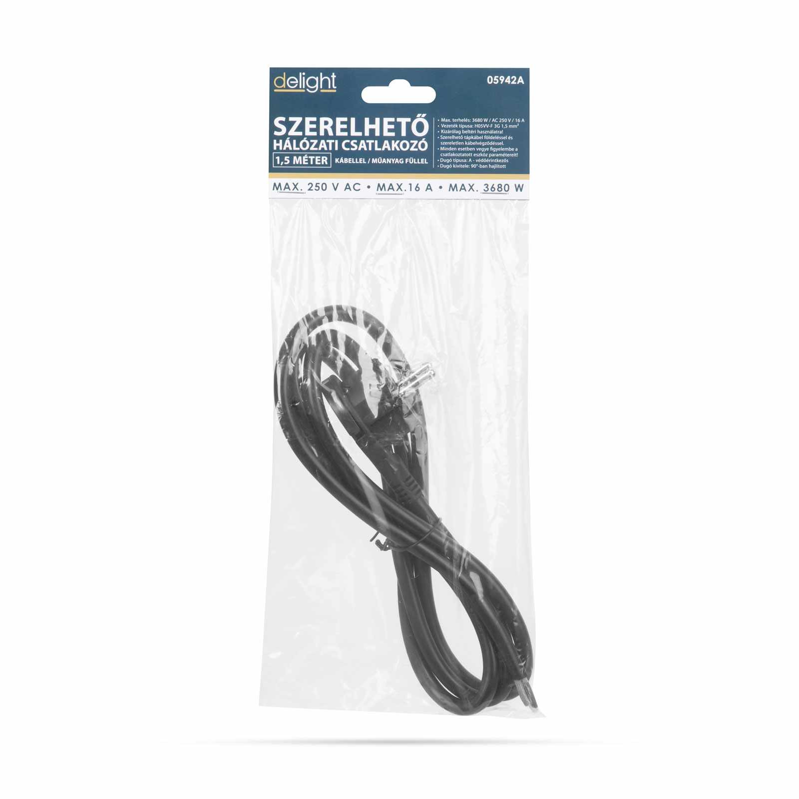 Dugó típusa: A - védőérintkezős Dugó kivitele: 90°-ban hajlított Max. áramerősség 10 / 16 A Névleges feszültség: 250 V AC, 50/60 Hz Vezeték típus: H05VV-F 3G 1,5 mm² Vezeték hossza: 1,5 m Szín: Fekete