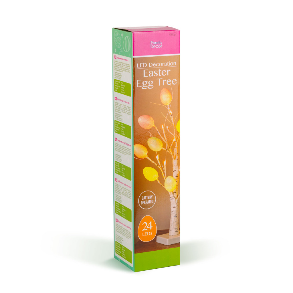 Varázsoljon meghitt húsvéti hangulatot otthonába ezzel a különleges tojásfa dekorációval! Az 55 cm magas, fehér színű fán, 10 db pasztell színű tojás van, amelyek környezetében és belsejében melegfehér LED-ek világítanak. A tojások színes felülete glitteres, így csodálatos hangulatot teremtenek, amikor a fény megcsillan rajtuk. Az összesen 24 LED-del ellátott dekoráció 3 darab AA elemmel működik, így bárhol könnyedén elhelyezhető: asztalon, polcon, vagy akár az ablakpárkányon.