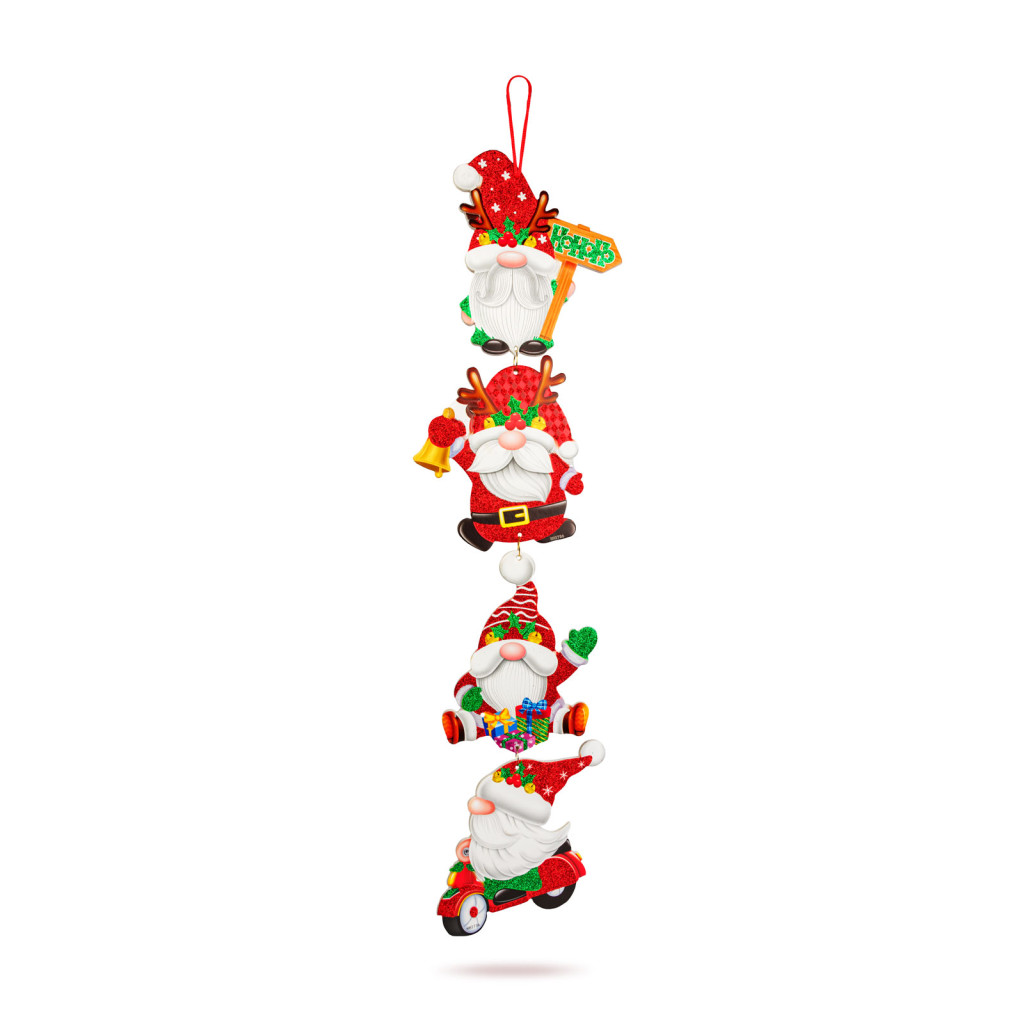 Dekorálja otthonát, irodáját ezzel a bájos, felakasztható karácsonyi manó dekorációval! Egy-egy dekoráción 4 aranyos manó figura helyezkedik el egymás alatt, színes, részletgazdag glitteres kiegészítőkkel. Ideális ablakra, ajtóra, falra, az akasztó segítségével bárhová könnyen felakasztható. Kiváló választás otthonra, irodába vagy ajándéknak is.