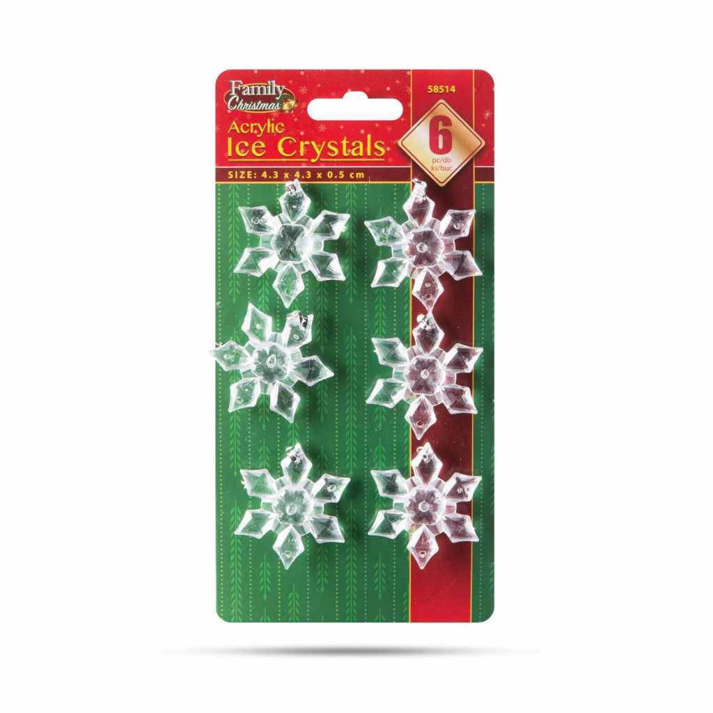 Díszítse fel karácsonyfáját ezekkel a csillogó jégkristályokkal! 6 db-os szett, amely akrilból készült jégkristály díszeket tartalmaz, amelyek garantáltan feldobják a karácsonyfát. Az elegáns, áttetsző anyag és a szépen kidolgozott jégkristály formák remekül mutatnak a fényekben. A díszek könnyűek, így nem terhelik a fát. A szett 6 db egyforma méretű jégkristályt tartalmaz, amelyeket bármilyen stílusú fán jól mutatnak.
