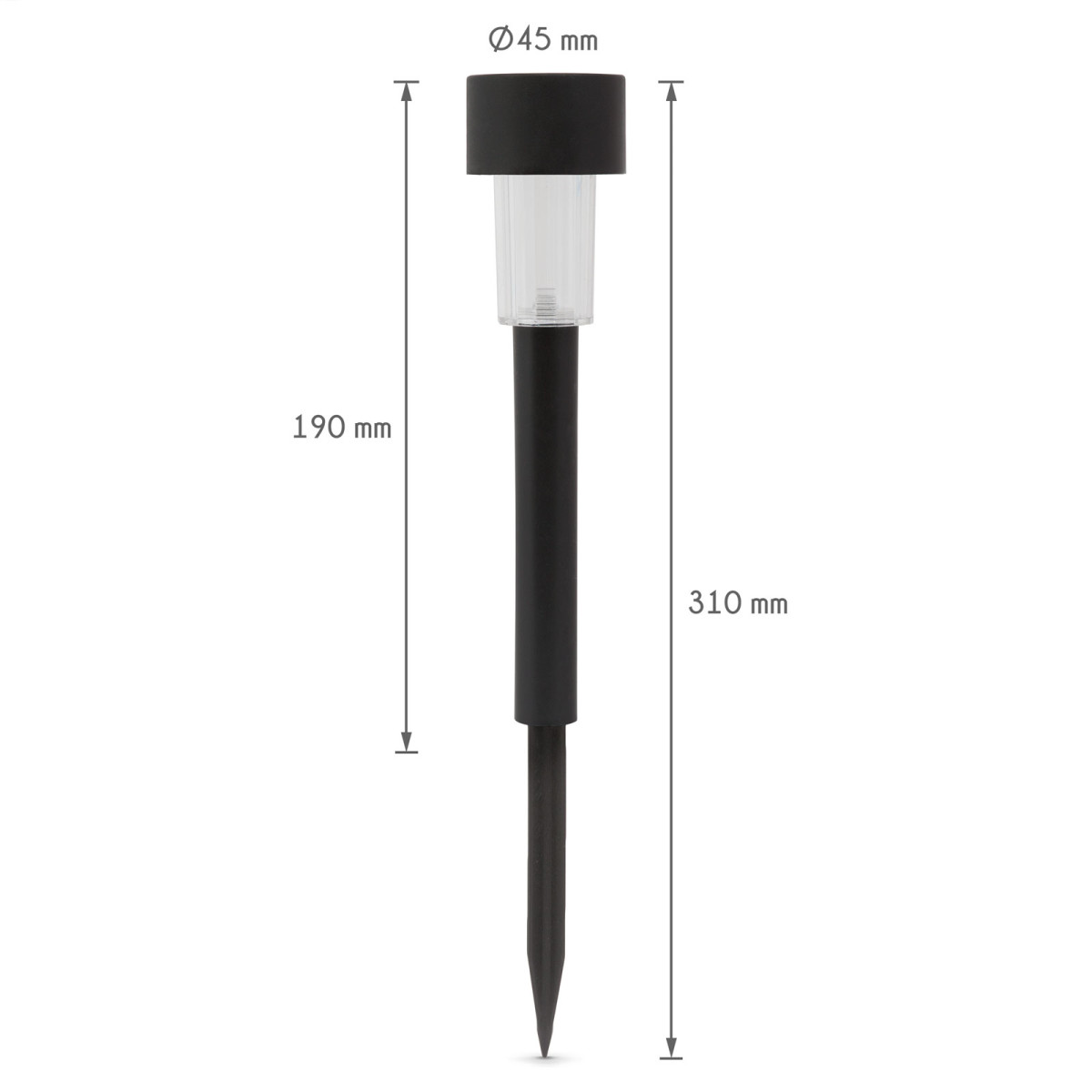 Fényforrás: LED LED-ek száma: 1 db LED színe: Hidegfehér Szolár panel: 25 x 25 mm, 2V, 10 mA Energiaforrás: 1.2V Ni-MH akkumulátor Akkumulátor kapacitás: 40 mAh Működési idő: 6 - 8 óra Méret: 300 x Ø45 mm Leszúrótüske hossza: 110 mm Anyag: Műanyag Súlya: ~38 g