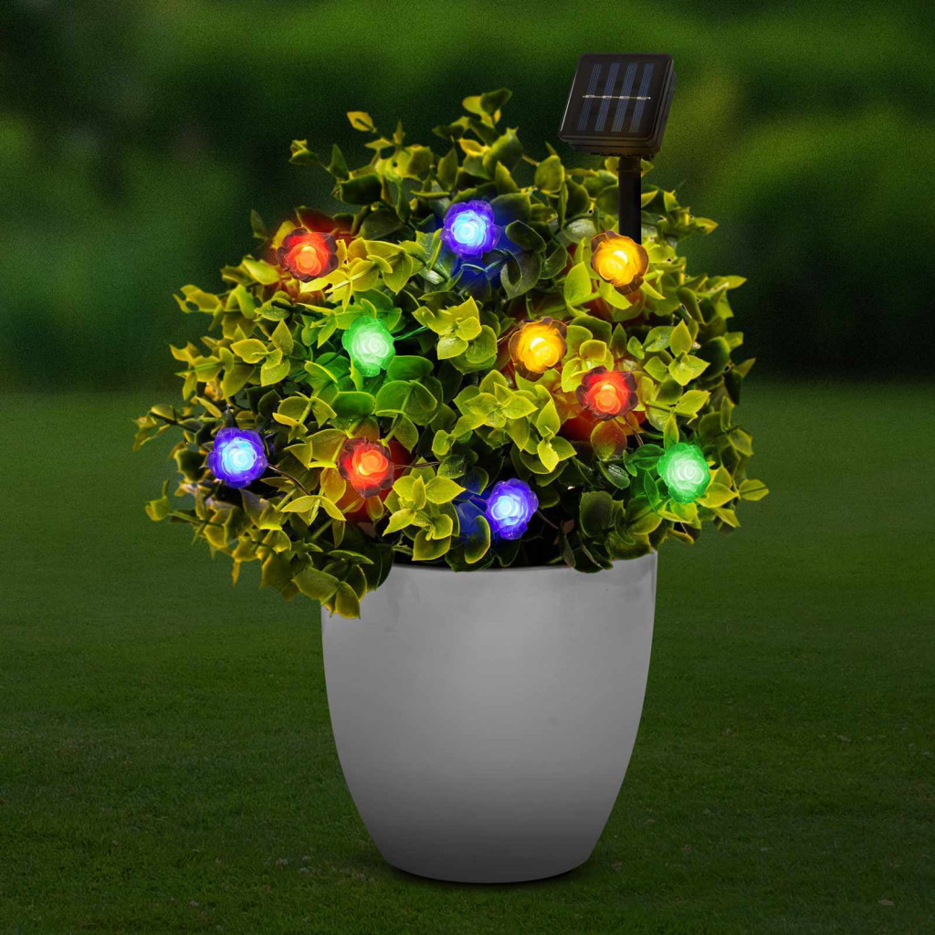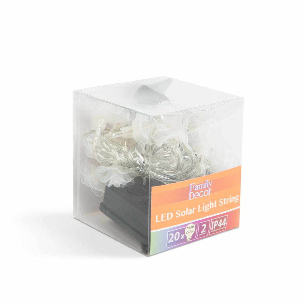 Nemcsak karácsonykor, az év bármely napján kiválóan hasznáható dekor fényfüzér. Az átlátszó kis virágokat színes LED-ek világítják meg, ezzel teremtve kellemes hangulatot hazaérkezéskor. A nap folyamán a szolár panel a napfényt elektromos árammá alakítja és feltölti a beépített akkumulátort. Szürkületkor a termék automatikusan bekapcsol, napfelkeltekor pedig ki. Ideális lehet bármilyen kertben, bokrok, fák, virágoskertek egyedi és különleges dekorálására.