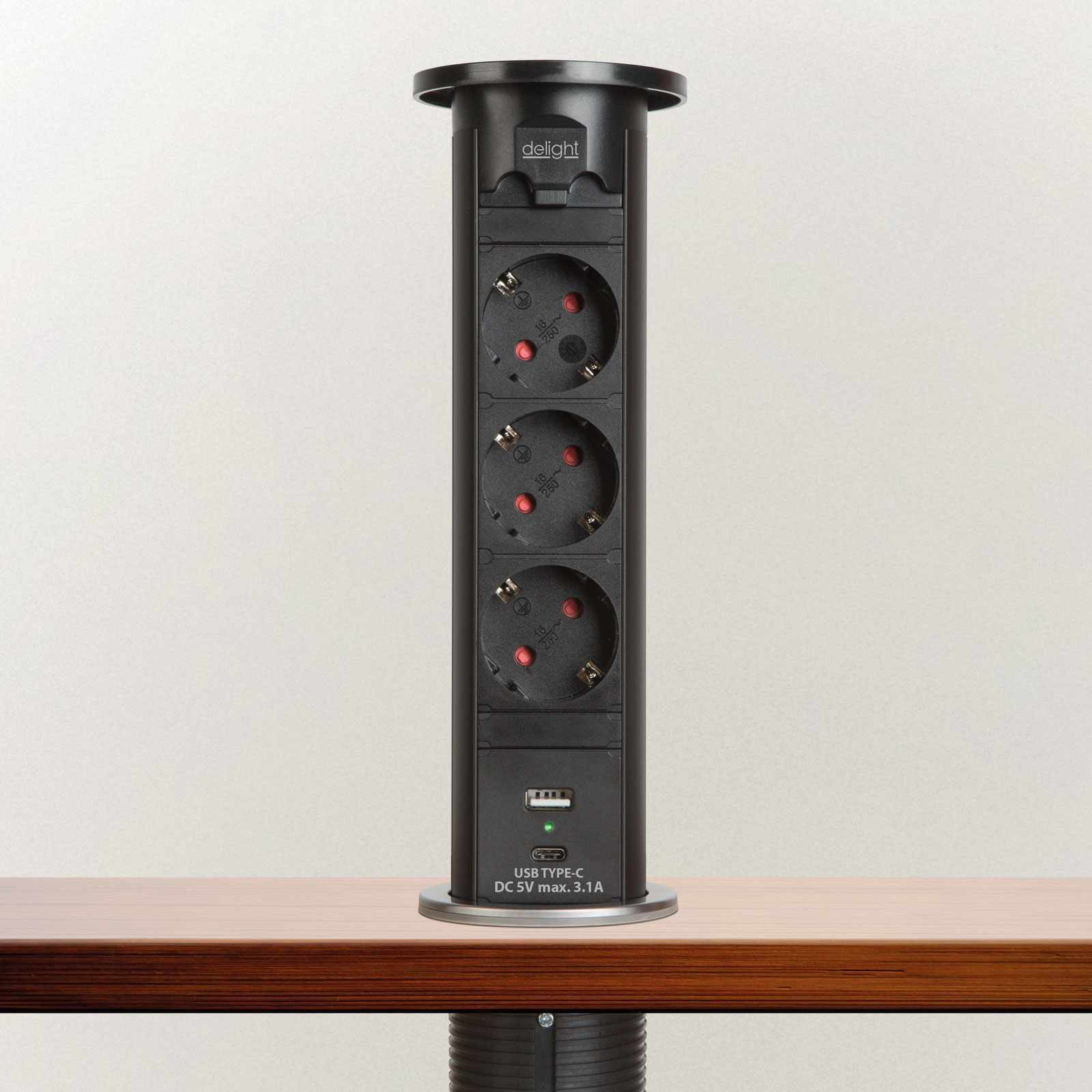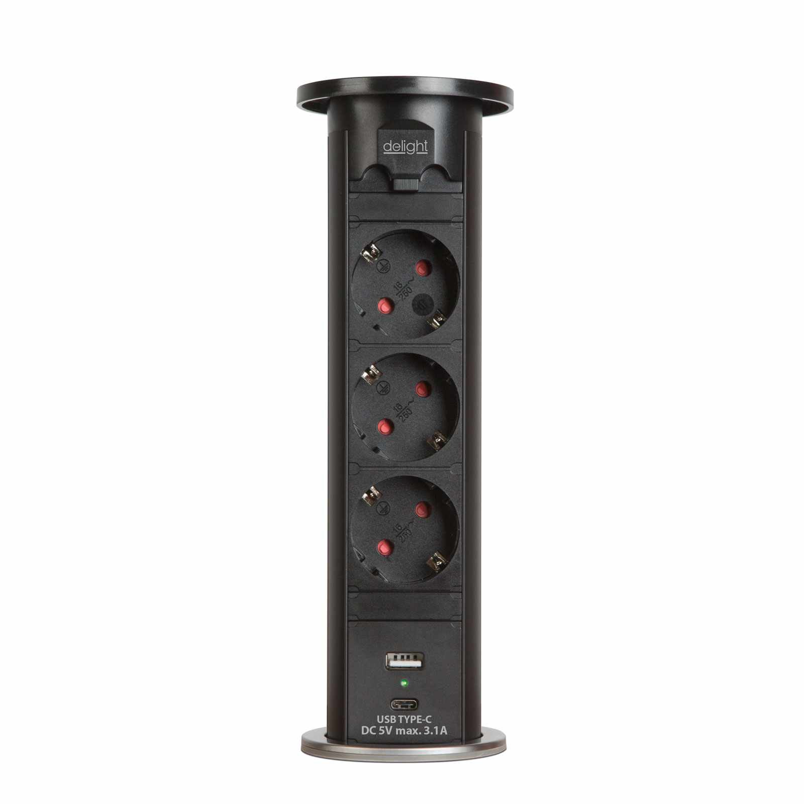 Motorosan süllyeszthető rejtett elosztó irodai és otthoni felhasználásra, fém házzal, 3 db gyermekvédelemmel ellátott hálózati aljzattal, dupla USB töltőegységgel. A legtöbb felületbe és design-ba beleillő kialakítás, függőleges beépítési lehetőség mérsékelten vízhatlan kezelőfelület.