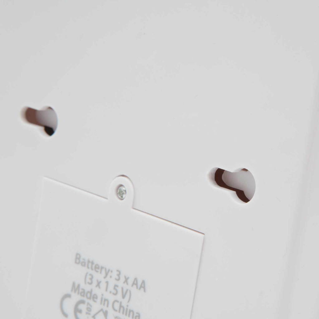 Sziréna hangereje: 100 dB Mozgásérzékelési távolság: max. 5 m Energiaforrás: 3 x AA elem (nem tartozék) Védelem: IP20 Színe: Fehér Mérete: 138 x 106 x 36 mm