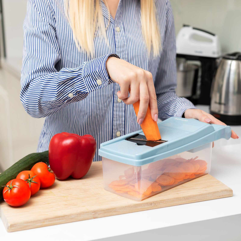 Vágjon, szeleteljen, aprítson, hámozzon zöldségeket, gyümölcsöket egyszerűen és gyorsan ennek a multifunkciós aprítónak köszönhetően. Minden konyha nélkülözhetetlen kelléke, használatával biztonságosabbá és gyorsabbá tehetőek a munkafolyamatok. A hagymaaprítás okozta könnyezés a múlté, aprítson egyenesen a tárolóedénybe, amely tetővel is rendelkezik, így akár későbbi felhasználásra is eltehető hűtőszekrénybe. Az ételdoboz áttetszősége miatt könnyen áttekinthető milyen élelmiszer van benne.