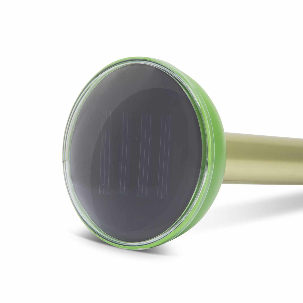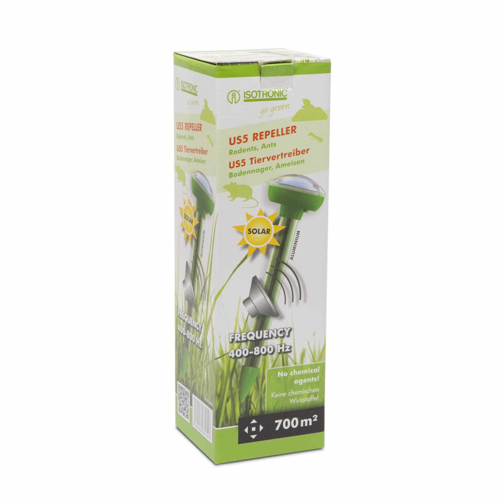 Az innovatív Napelemes hangya-, vakond-, egérriasztó az Isotronic kiváló terméke. Napelemmel működő, hordozható és rendkívül hatékonyan alkalmazható, bármilyen kémiai anyag nélkül mely magas fokú környezetvédelmet biztosít. Ezzel a készülékkel egy modern állatriasztó birtokába jutott. A készülék kvarcrezgéseket állít elő kb. 40 mp-es időközökben a 400-800 Hz ± 50 Hz frekvenciatartományban. A speciális keltésű hangfrekvenciás jelek és rezgések szabadtéri vizsgálatokban kb. 700 m² optimális hatáskörzetet mutattak. A talaj milyenségétől függően ez a körzet változhat. Mivel a hangfrekvenciás jelek és rezgések a talajban élő sok állat számára elviselhetetlenek, már néhány nap múlva más tájra vándorolnak el. Más hasznos állatokat viszont ezek a frekvenciák nem zavarnak. Ennek a napelemes állatriasztónak az alkalmazási területei a kertek, szántóföldek és más területek a szabadban, ahol nem kívánatosállatok élnek a talajban. A finom beállítású elektronika a nagyteljesítményű napelemtáblákkal még rossz fényviszonyok esetén is azonos szinten működik. Ez a készülék elűzi a pockokat, egereket, a vakondokat, hangyákat, kígyókat és más, a talajban élõ állatokat.