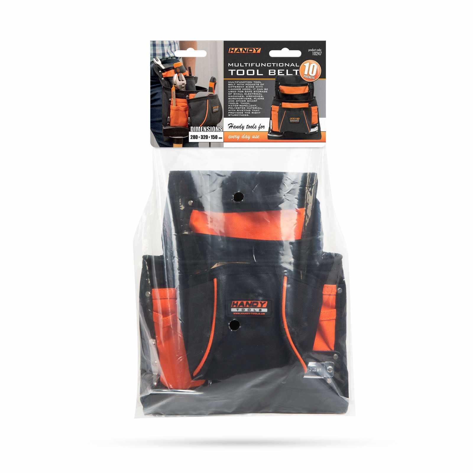 Különböző méretű zsebekkel rendelkező multifunkciós szerszámos övtáska, kalapácsakasztóval. Alkalmas lehet kisebb elektromos gépek, villáskulcsok, csavarhúzók, fogók és egyéb, akár éles szerszámok biztonságos tárolására. Vastag, vízlepergető, poliészter anyagból készült, a szegecselés kellő strapabíróságot biztosít.