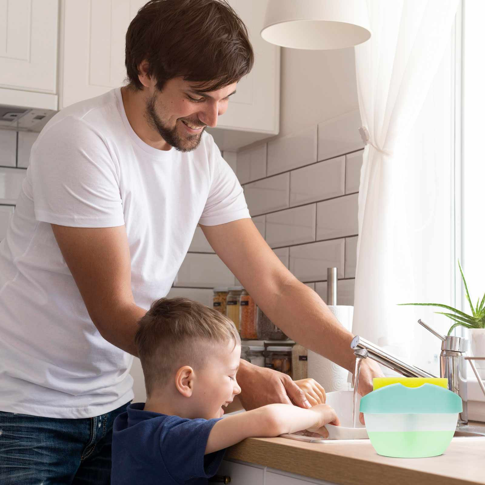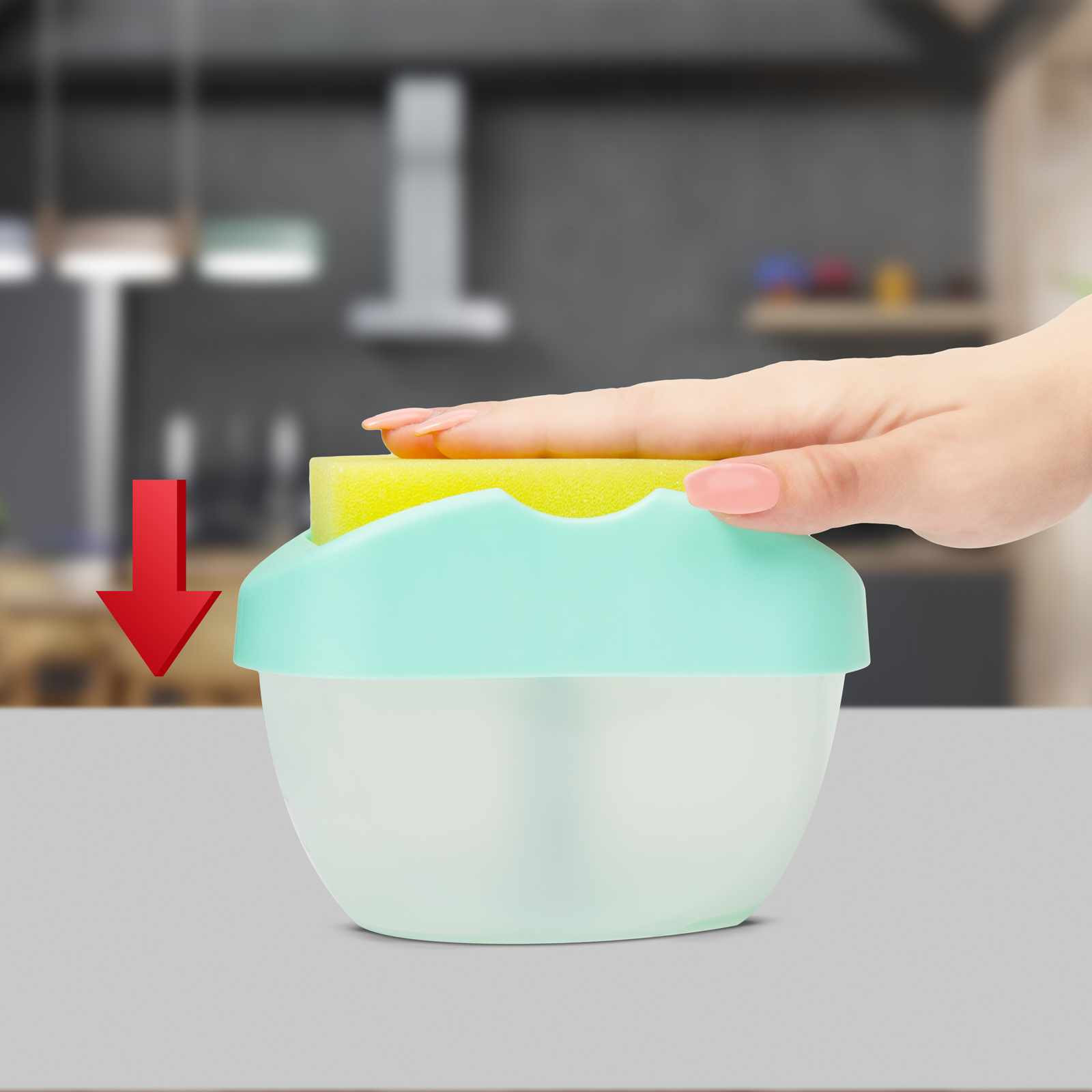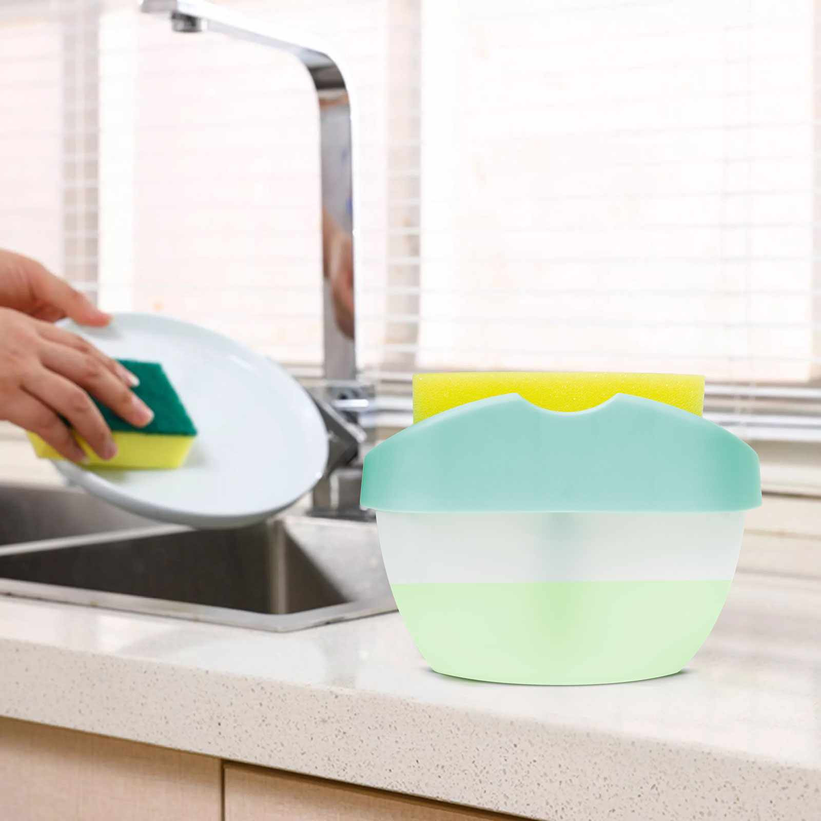 Praktikus háztartási eszköz, amely megkönnyíti a mosogatószer adagolást és felhasználást. Egyszerűen töltse fel a tárolóedényt mosogatószerrel, helyezze a tetejére a szivacsot és nyomja lefelé a mosogatószer pumpáláshoz. A pumpálás során csak a szükséges mennyiséget juttatja a szivacsra. Az edény teteje kialakításánál fogva alkalmas szivacstartóként is, így az esetleges tisztítószer visszajuthat a gyűjtőedénybe.