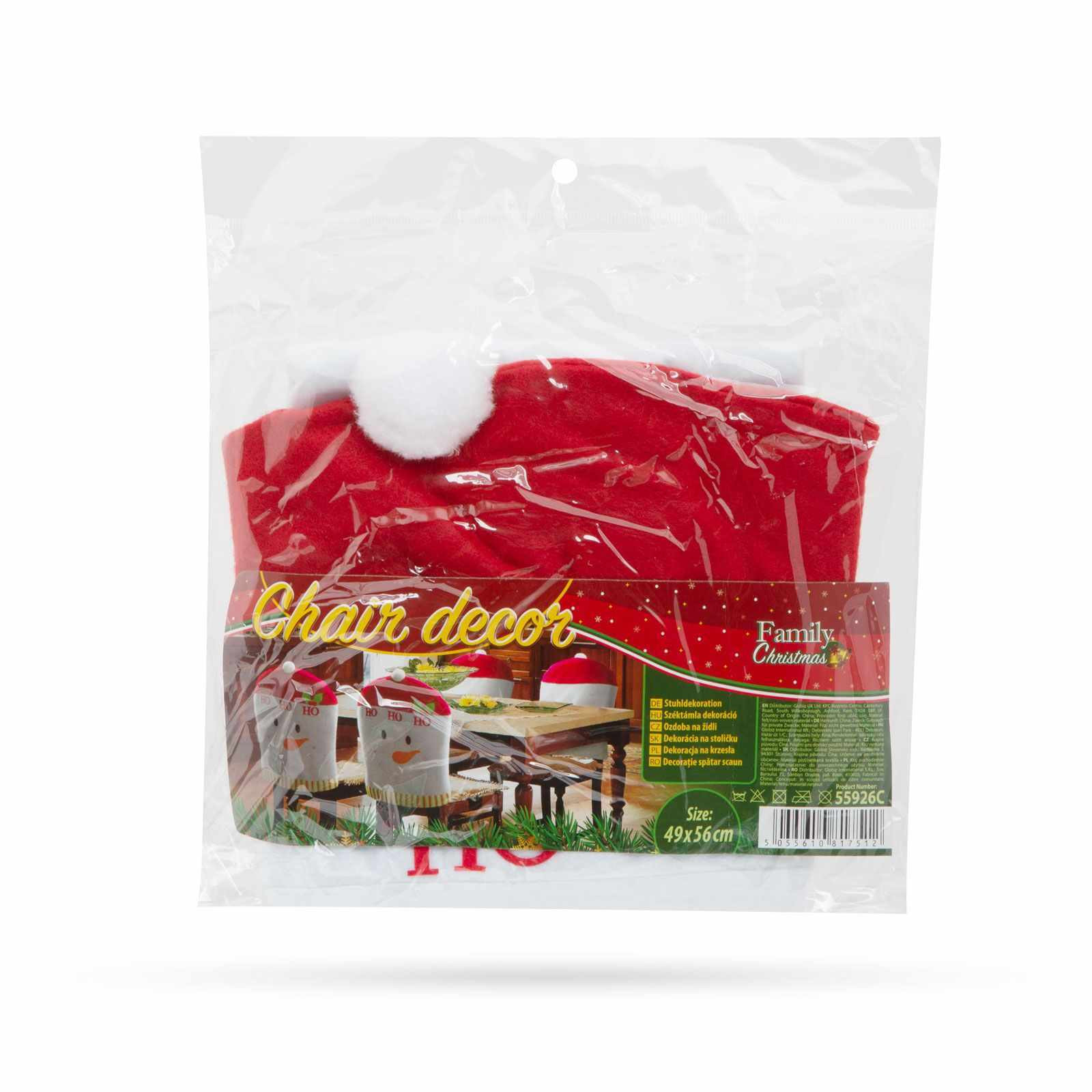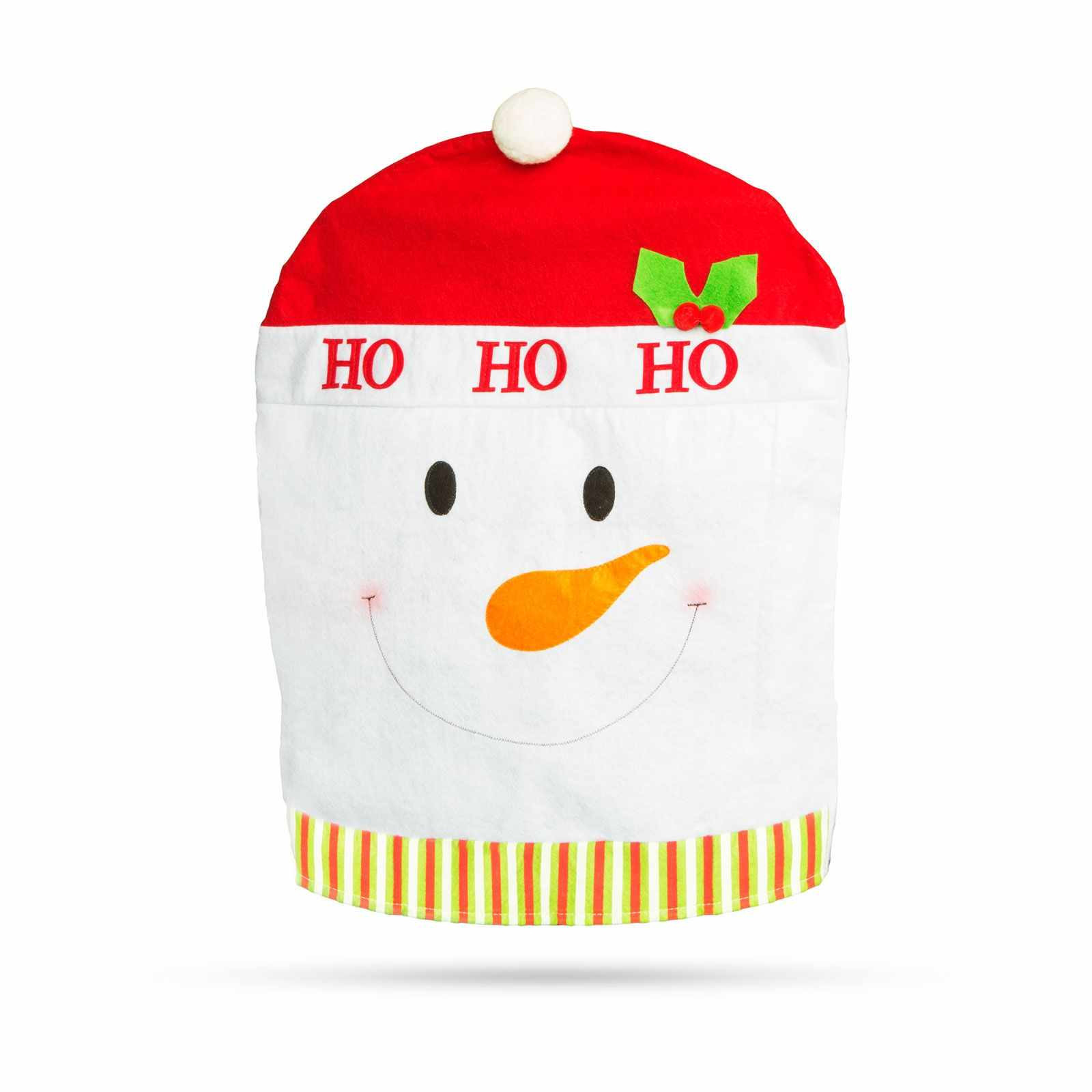 Mikulássapka formájú, domború hóember mintával ellátott székdekoráció az ünnepekre.