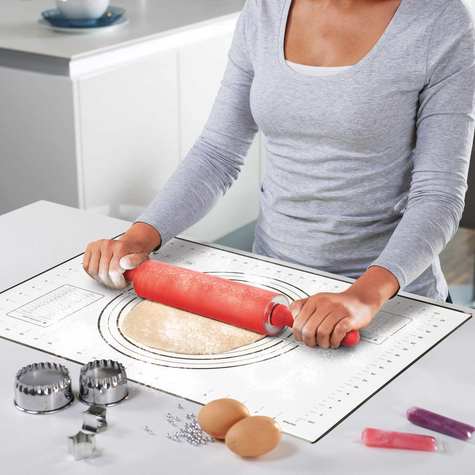 - A nyújtólap oldalán található cm beosztás és a közepén elhelyezett körsablonok segítenek abban, hogy a megfelelő méretűre nyújtsa a tésztát