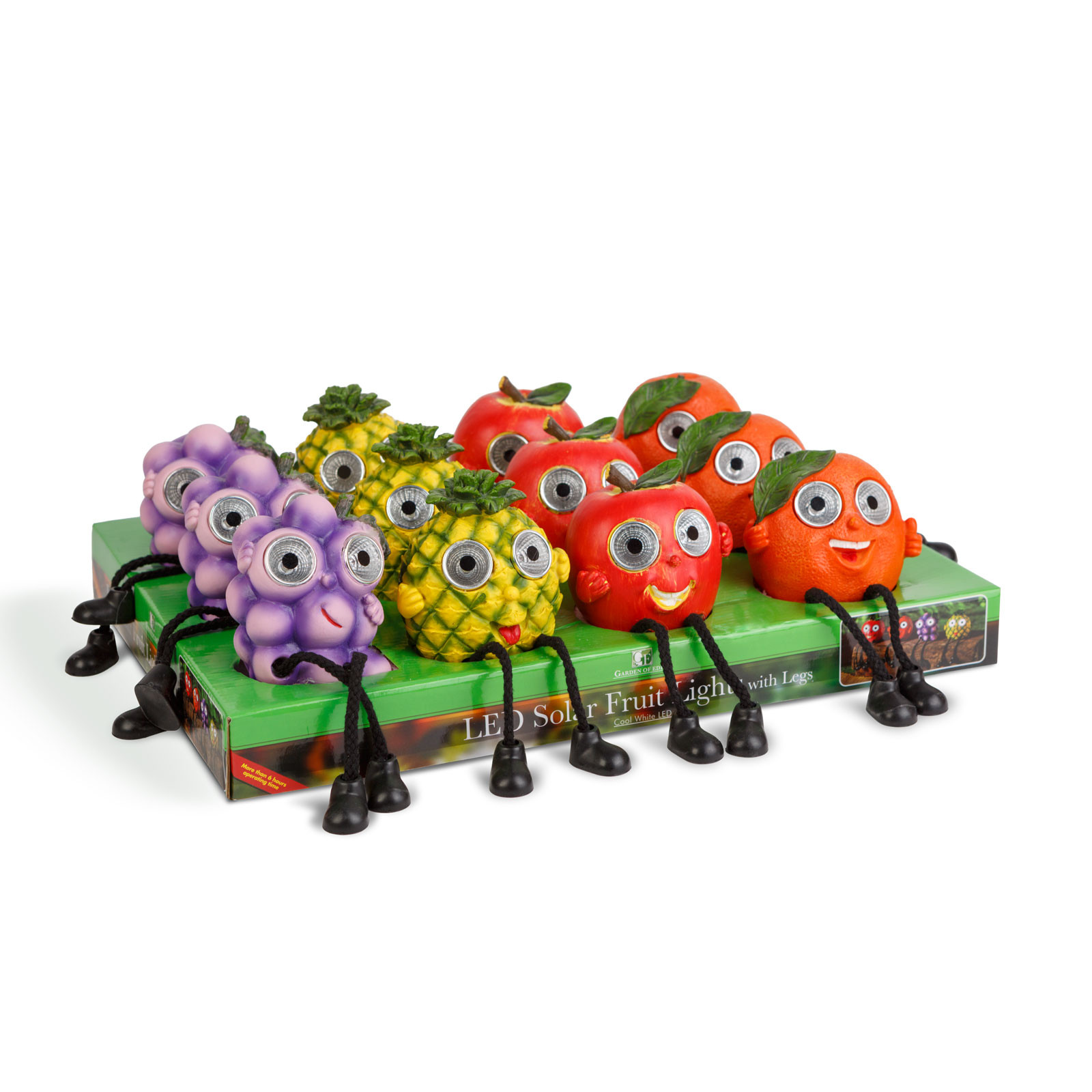 Dobja fel kertjét vagy teraszát ezekkel a vidám szolár gyümölcsökkel! Négy különböző, mókás figurából választhat, úgy mint narancs, szőlő, alma vagy ananász, mindegyik forma szeme világít. A beépített, hidegfehér LED-ek automatikusan felkapcsolnak szürkületkor és nagy fényerővel világítják meg környezetüket. Nincs szükség külső áramforrásra, elemcserére, a szolár panelen keresztül napenergiával töltődik fel az akkumulátor. Tökéletes választás, ha mosolyt szeretne csalni vendégei arcára, vagy ha egy igazán különleges kertre várgyik!