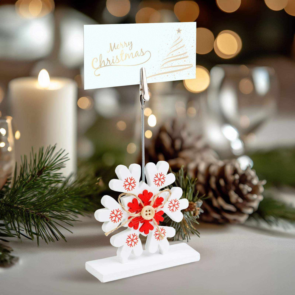 Ez a karácsonyi ültetőkártya tartó tökéletes választás minden ünnepi rendezvényhez, ebédhez, vacsorához. Jelölje meg vendégei helyét az asztalnál vagy egyszerűen kívánjon Boldog Karácsonyt nekik! A kártya fából készült, amely időtálló és környezetbarát anyag, miközben hozzájárul az ünnepi dekorációhoz. A tetején található csipesszel könnyedén rögzítheti az ültetőkártyát. Egyedi és hangulatos megjelenése miatt a siker garantált!